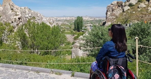 As we left the bus behind, I noticed Rita was moving rather stubbornly. Our foreheads already slick from the morning sun, Helen and I were quickly working up a heavy sweat trudging up the rocky pathway that led to the main entrance. We’d pause abruptly every couple of meters, with my body jerking forward and my neck jutting out like a hungry little sea turtle. With confusion drawn across our faces, we stopped and looked down at Rita’s wheels and both our mouths gaped open. The left caster (front) wheel was barely attached to its fork (where the wheel is fitted) and was, in fact, coming apart. For the first time ever, I had a glimpse of what it feels like to almost pass out from the sheer shock of a moment. My head spun like the inside of a blender and my clammy fingers cupped my forehead like moist mop threads. My underarms sweated through my sky-blue dress, as beads of panic rolled over my cat-eye sunglasses. I felt like a contestant on Survivor, out in the middle of nowhere with no celebrity host or camera crew to lean on in case of emergency. Here we were, chair-wrecked, my studio audience a blur of sweaty tourists. “Oh shit,” was all I could muster. “We might need to have a little talk later, Rita,” I thought grudgingly.